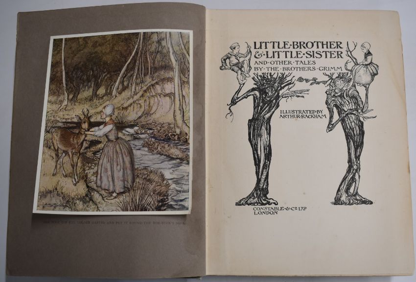 Little Brother & Little Sister and Other Tales by The Brothers Grimm and Illustrated by Arthur Rackham, published Constable 1917 first edition with 12 coloured plates tipped-in on lettered mounts (complete) and many black & white illustrations in original gilt cloth (lacking front endpaper), The Personal History of David Copperfield by Charles Dickens illustrated in colour by Frank Reynolds (c.1920s), gilt cloth in original (worn) dust-wrapper (2)