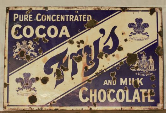 Vintage enamel advertising sign 'Fry's Cocoa and Milk Chocolate', 76 x 115cmPLEASE NOTE this lot is located at and will be sold from Cocknells Farm, Moreton Valence, Gloucester GL2 7LZ. Viewing is available on Tuesday 6th July 10am to 4pm and before the sale on Saturday 10th July from 9am to 11am, no appointment is necessary but we will limit numbers if required to ensure social distancing is observedWe are not able to offer our usual postage service for this lot
