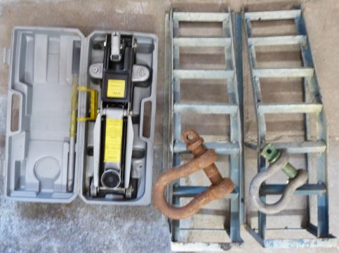 Trolley jack, pair of car ramps and two shackles