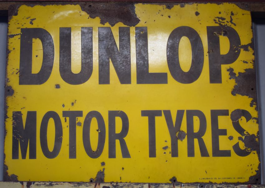 Vintage enamel advertising sign 'Dunlop Motor Tyres', 92 x 122cmPLEASE NOTE this lot is located at and will be sold from Cocknells Farm, Moreton Valence, Gloucester GL2 7LZ. Viewing is available on Tuesday 6th July 10am to 4pm and before the sale on Saturday 10th July from 9am to 11am, no appointment is necessary but we will limit numbers if required to ensure social distancing is observedWe are not able to offer our usual postage service for this lot