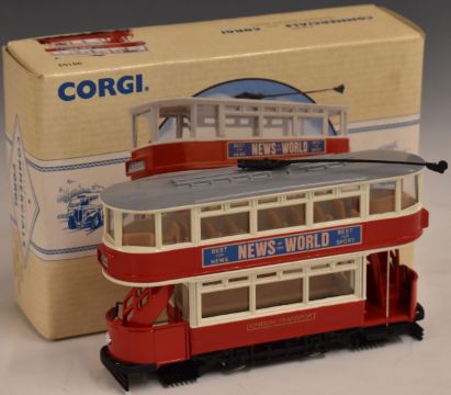 Sixteen Corgi Classic Commercials and Public Transport diecast model tram sets including 97268 Double Deck Tram London County Council, 98152 Closed Top Tram Glasgow, 97365 Double Deck Open Top Tram Blackpool and 98154 Fully Closed Tram Dover, all in original boxes.