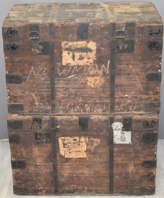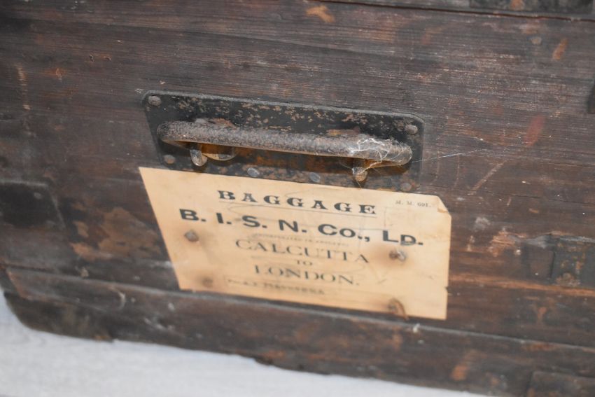 19th/20thC pair of metal bound, zinc lined twin handled wooden steamer trunks with shipping labels, 'Calcutta To London per 55 Mashobra', W76 X D46 x H47