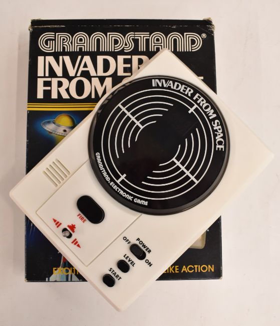 Three vintage Grandstand video games consoles, Star Force, Invader From Space and The Big Game Electronic Soccer, all in original boxes.