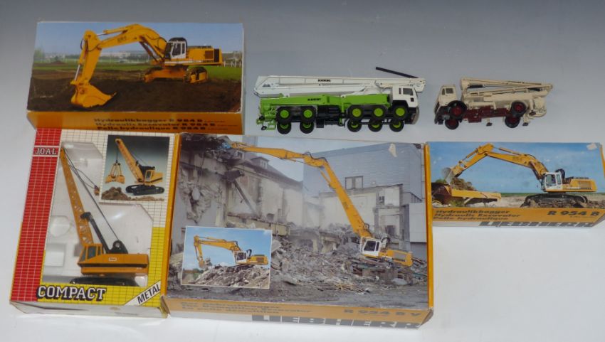 Six Joal, Liebherr and similar diecast model construction vehicles, all in original boxes.