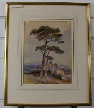 Attributed to William Leighton Leitch (1804-1883) watercolour landscape trees and villa in an Italian landscape, 29 x 22cm, in gilt frame with label to glass