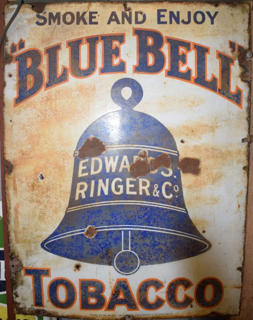 Vintage enamel advertising sign 'Edwards Ringer & Co Blue Bell Tobacco', 102 x 76cmPLEASE NOTE this lot is located at and will be sold from Cocknells Farm, Moreton Valence, Gloucester GL2 7LZ. Viewing is available on Tuesday 6th July 10am to 4pm and before the sale on Saturday 10th July from 9am to 11am, no appointment is necessary but we will limit numbers if required to ensure social distancing is observedWe are not able to offer our usual postage service for this lot