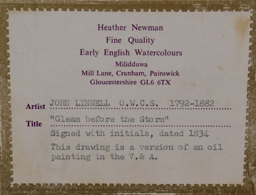 John Linnell OWCS (1792-1882) painting Gleam Before the Storm, initialled and dated 1834 to lower edge, 30 x 37cm, in gilt frame with label verso