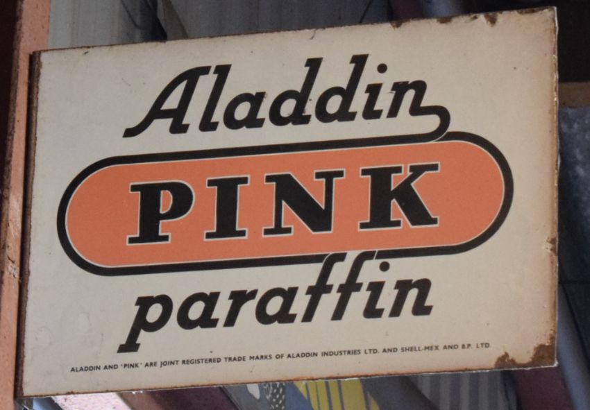 Vintage double sided enamel advertising sign 'Aladdin Pink Paraffin', 36 x 53cmPLEASE NOTE this lot is located at and will be sold from Cocknells Farm, Moreton Valence, Gloucester GL2 7LZ. Viewing is available on Tuesday 6th July 10am to 4pm and before the sale on Saturday 10th July from 9am to 11am, no appointment is necessary but we will limit numbers if required to ensure social distancing is observedWe are not able to offer our usual postage service for this lot