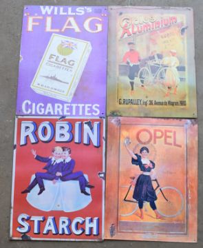 Four metal advertising signs comprising Wills's, Robin Starch, Opel & Cycles, each approximately 60.5 x 45.5cmPLEASE NOTE this lot is located at and will be sold from Cocknells Farm, Moreton Valence, Gloucester GL2 7LZ. Viewing is available on Tuesday 6th July 10am to 4pm and before the sale on Saturday 10th July from 9am to 11am, no appointment is necessary but we will limit numbers if required to ensure social distancing is observedWe are not able to offer our usual postage service for this lot