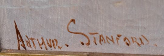 Arthur Stanford late 19th or early 20thC oil on canvas Highland loch scene with cottage and cattle watering, 36 x 49cm, in gilt frame