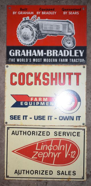 Three enamel advertising signs comprising Graham-Bradley, Cockshutt & Lincoln Zephyr, largest 23 x 30.5cm PLEASE NOTE this lot is located at and will be sold from Cocknells Farm, Moreton Valence, Gloucester GL2 7LZ. Viewing is available on Tuesday 6th July 10am to 4pm and before the sale on Saturday 10th July from 9am to 11am, no appointment is necessary but we will limit numbers if required to ensure social distancing is observedWe are not able to offer our usual postage service for this lot