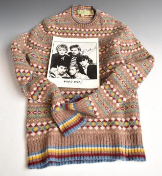 French Connection Shetland wool jumper, by repute given to the vendor by Simon Le Bon, together with a photograph of Duran Duran signed by the band