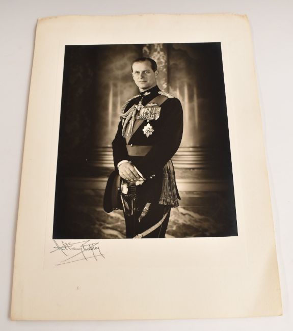 Anthony Buckley two black and white photographic studies of Her Majesty Queen Elizabeth II and HRH Prince Philip, Duke of Edinburgh, the first a portrait of Queen Elizabeth II seated, 25 x 20cm in card mount signed by the photographer, number 4474-14 in pencil verso, the other a three quarter length portrait of Prince Philip in military dress uniform, 25 x 20cm, in card mount signed by the photographer, number 4850-10 verso.