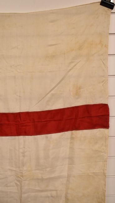 A vintage British ensign silk flag (only used for royalty), probably c1930s, 100 x 180cm. From the same vendor as William Minchall Birchall paintings of HMS Norfolk (Lot 124) and Queen Elizabeth (Lot 123) c1931-1933. The vendor's father was Mountbattern's first lieutenant on the destroyer which acted as guardship when Edward VIII and Wallace Simpson went to Cannes in 1936