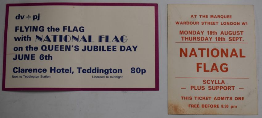 National Flag - Thank You and Goodnight, record appears VG with soft scuff side 1 track 3, with plain black labels, pasted cover shows signs of wear and tear to front, includes blue insert. Also two National Flag gig tickets
