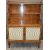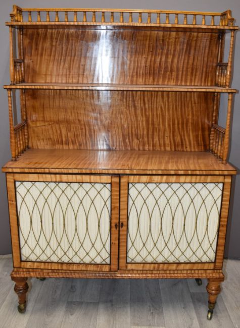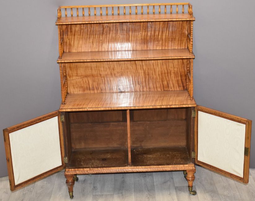 19thC satinwood waterfall bookcase cabinet with bobbin turned gallery and supports, wirework and linenfold cabinet doors, raised on stepped turned legs and castors, W76 x D27 x H112cm