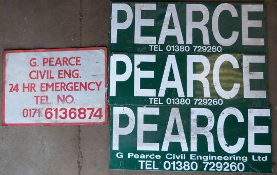 Four Pearce Civil Engineering signs, largest 60 x 150cm PLEASE NOTE this lot is located at and will be sold from Cocknells Farm, Moreton Valence, Gloucester GL2 7LZ. Viewing is available on Tuesday 6th July 10am to 4pm and before the sale on Saturday 10th July from 9am to 11am, no appointment is necessary but we will limit numbers if required to ensure social distancing is observedWe are not able to offer our usual postage service for this lot