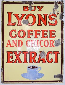 Vintage enamel advertising sign 'Buy Lyon's Coffee and Chicory Extract' with coffee cup and saucer decoration to base, 99 x 75cmPLEASE NOTE this lot is located at and will be sold from Cocknells Farm, Moreton Valence, Gloucester GL2 7LZ. Viewing is available on Tuesday 6th July 10am to 4pm and before the sale on Saturday 10th July from 9am to 11am, no appointment is necessary but we will limit numbers if required to ensure social distancing is observedWe are not able to offer our usual postage service for this lot