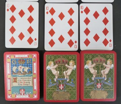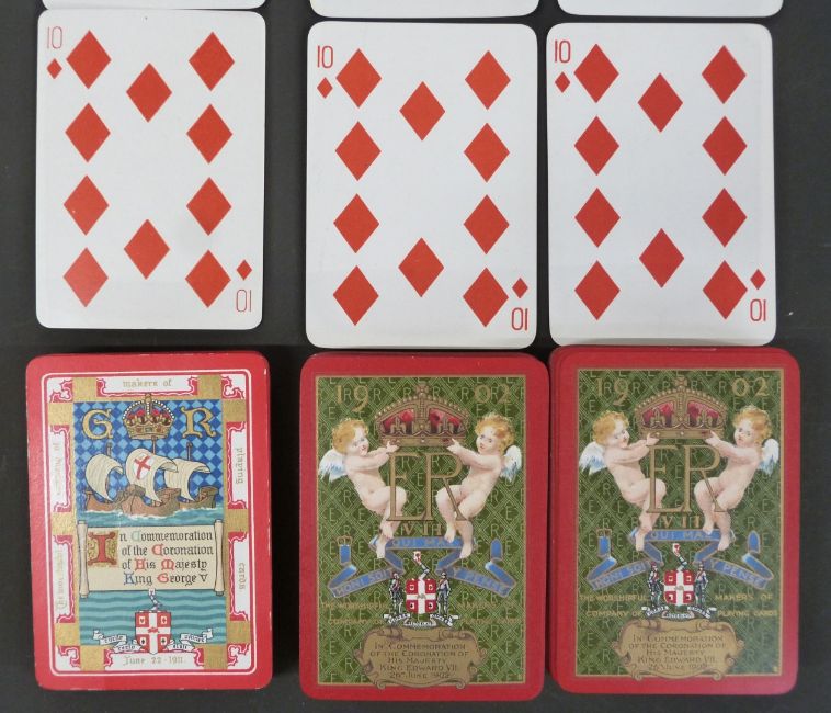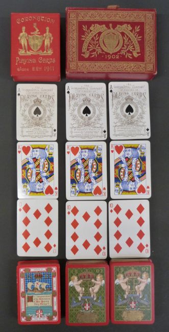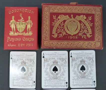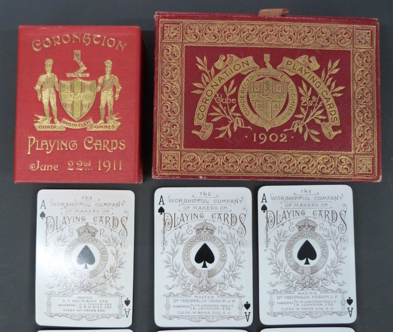 Three packs of Worshipful Company of Makers of Playing Cards playing cards commemorative packs comprising 1902 Edward VII coronation double pack and 1911 George V coronation, in original slip cases