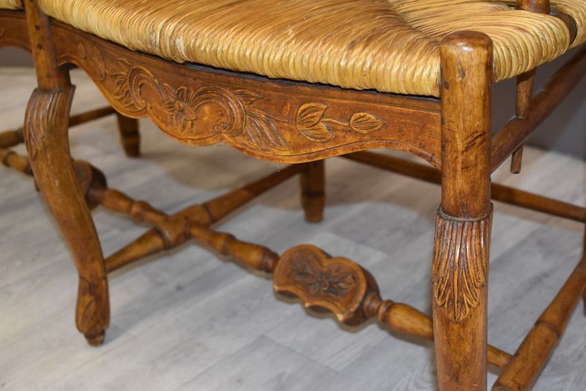 19thC carved oak Arts and Crafts style rush seated sofa, W111 x D54 x H95cm