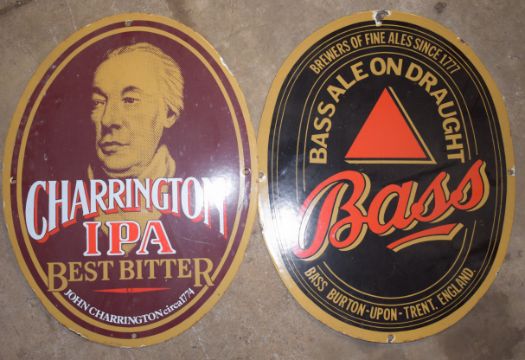 Two vintage enamel advertising signs comprising Charrington & Bass, maximum diameter 46cmPLEASE NOTE this lot is located at and will be sold from Cocknells Farm, Moreton Valence, Gloucester GL2 7LZ. Viewing is available on Tuesday 6th July 10am to 4pm and before the sale on Saturday 10th July from 9am to 11am, no appointment is necessary but we will limit numbers if required to ensure social distancing is observedWe are not able to offer our usual postage service for this lot
