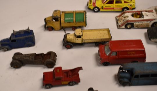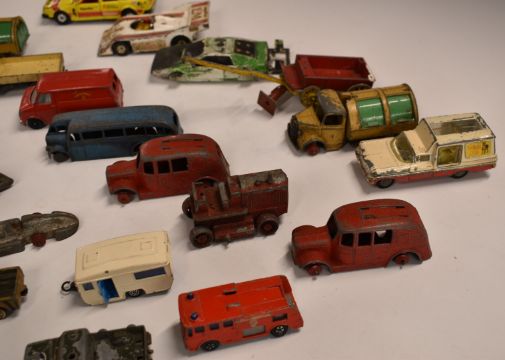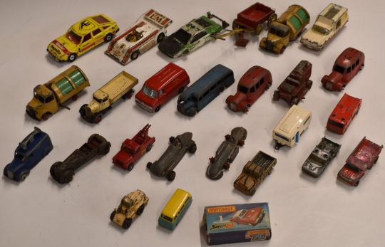 Twenty six Dinky, Corgi and Matchbox diecast model vehicles including a loudspeaker van, Kennel Club van, fire engine etc together with an empty Matchbox Superfast box