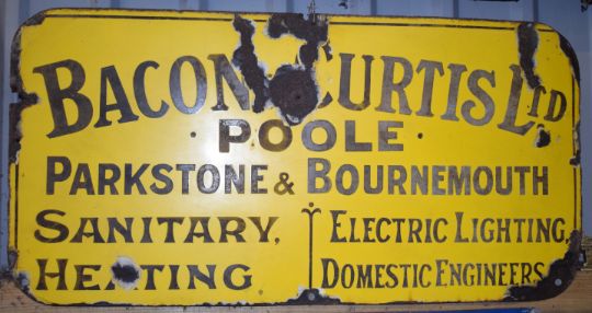 Vintage enamel advertising sign 'Bacon & Curtis Ltd, Poole Parkstone & Bournemouth', 46 x 91cmPLEASE NOTE this lot is located at and will be sold from Cocknells Farm, Moreton Valence, Gloucester GL2 7LZ. Viewing is available on Tuesday 6th July 10am to 4pm and before the sale on Saturday 10th July from 9am to 11am, no appointment is necessary but we will limit numbers if required to ensure social distancing is observedWe are not able to offer our usual postage service for this lot