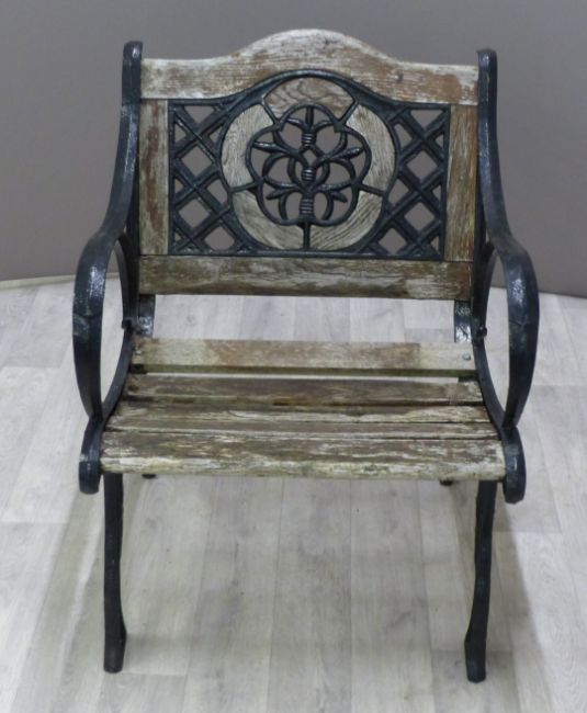 Four vintage heavy cast / wrought iron and teak garden chairs, W61cm