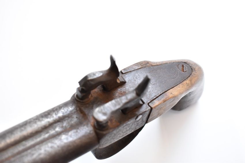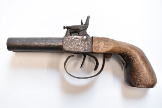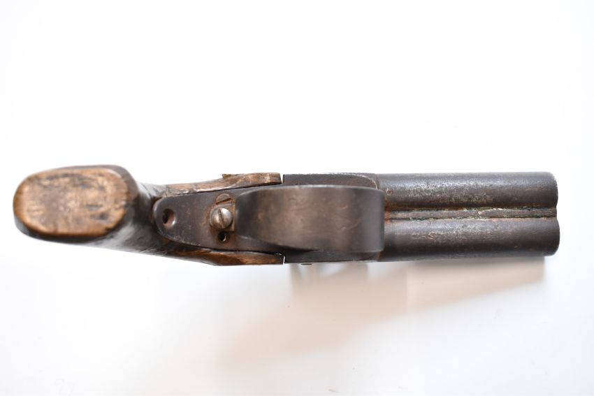Unnamed side by side percussion hammer action pocket pistol with engraved locks and top plate, shaped wooden grips and 3 inch barrels, overall length 19cm.