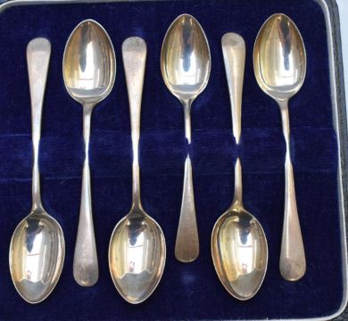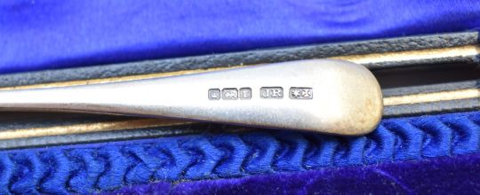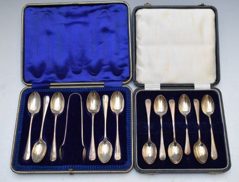 Two cased sets of hallmarked silver teaspoons, one of rat tail design with sugar tongs, weight 236g