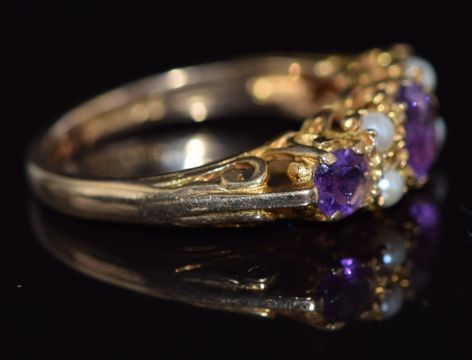 A 9ct gold ring set with an amethyst and pearls, 3.7g, size O