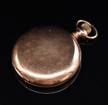 Rolex gold plated keyless winding open faced pocket watch with subsidiary seconds dial, gold hands, black Arabic numerals, railroad minutes track, white enamel dial and signed movement, case diameter 52mm, serial number 705821