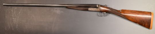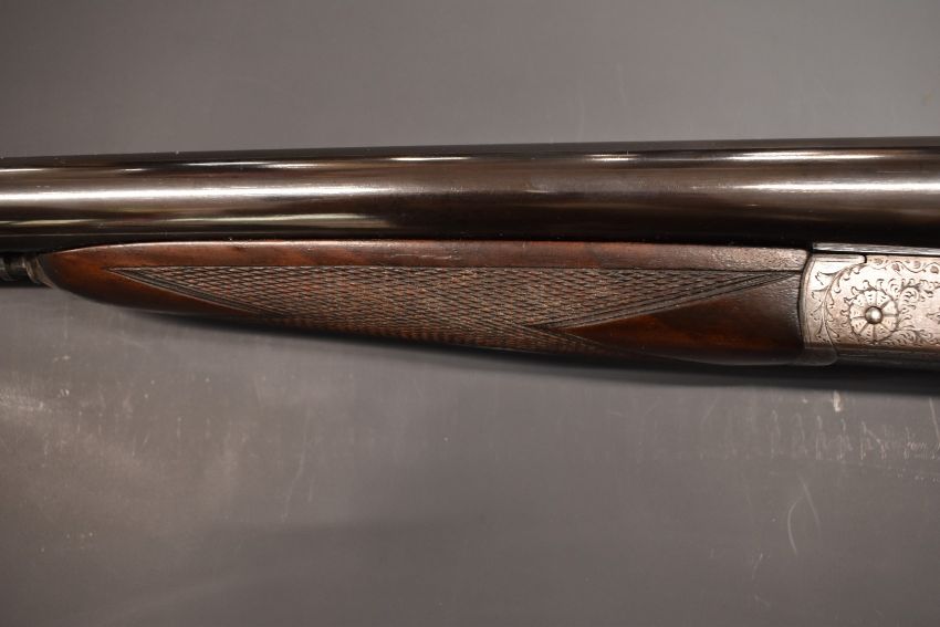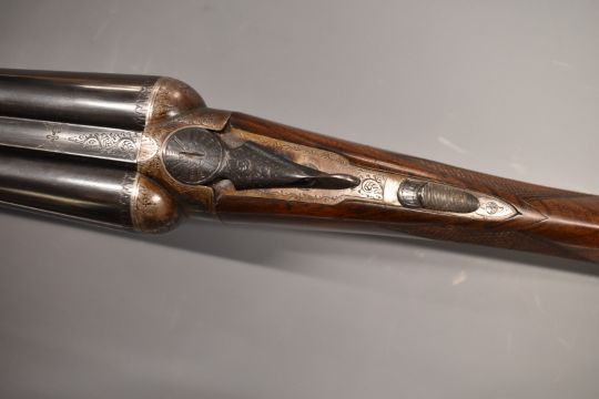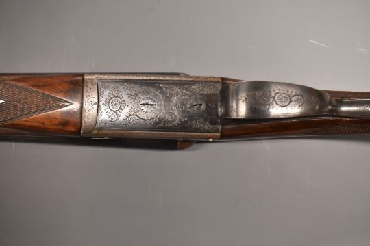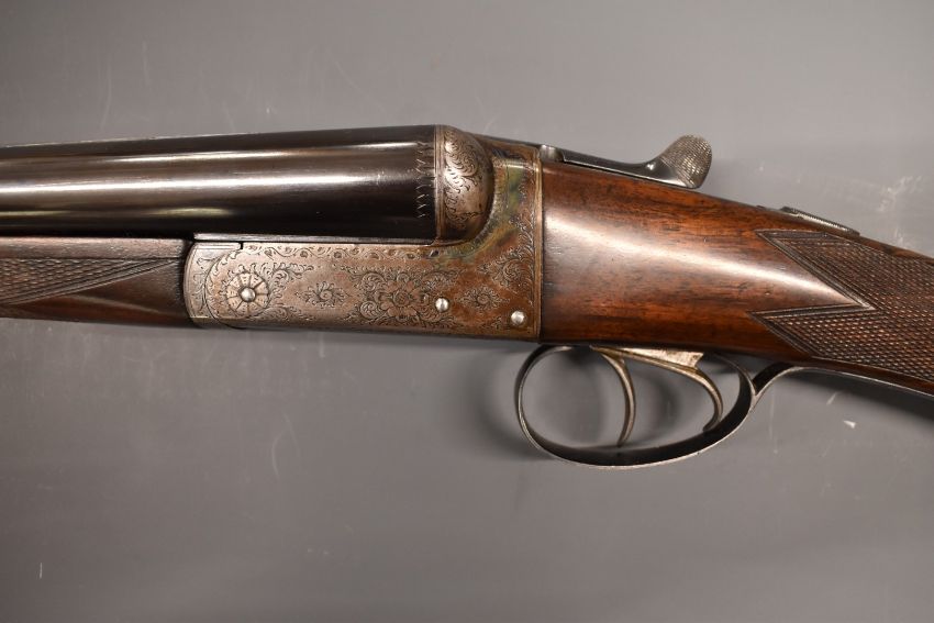 John Hughes & Son 12 bore side by side shotgun with engraved lock, trigger guard, underside, fences, top plate and thumb lever, chequered grip and forend, vacant cartouche to the underside of the stock, double trigger and named 28 inch barrels full and unchoked, overall length 113.5cm, length of pull 37cm, serial number 6219.  PLEASE NOTE THAT A VALID RELEVANT FIREARMS/SHOTGUN CERTIFICATE IS REQUIRED TO HANDLE/PURCHASE THIS ITEM.