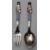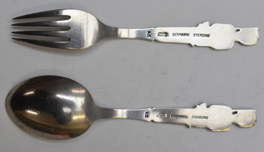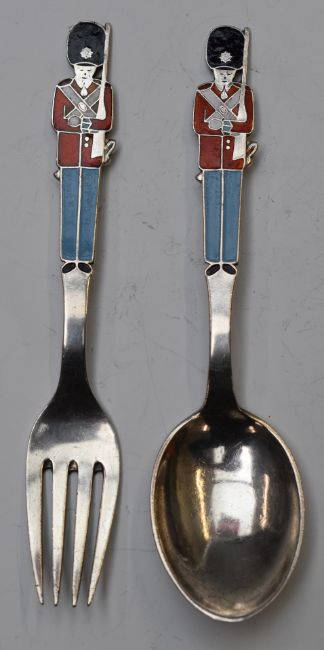 Danish sterling silver novelty spoon and fork with enamelled decoration of guardsmen with bearskins, impressed Monster Beskyttet and AG, length 13.5cm, weight 45g