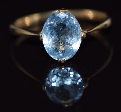A 9ct gold ring set with an oval cut blue topaz, 1.4g, size L/M