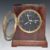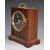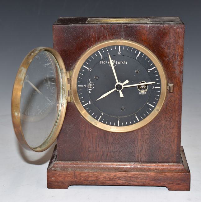 A mahogany cased military style mantel clock with stop/start, black dial, white hands and makers and brass campaign style folding handle, H19cm