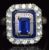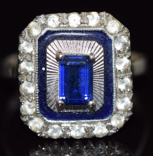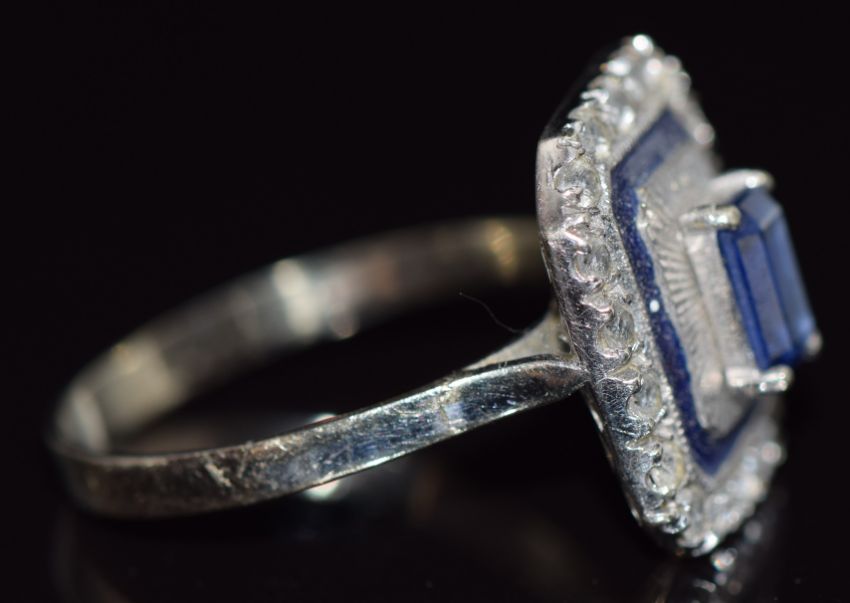 An 18ct white gold ring set with an emerald cut synthetic sapphire and paste, 3.7g, size N