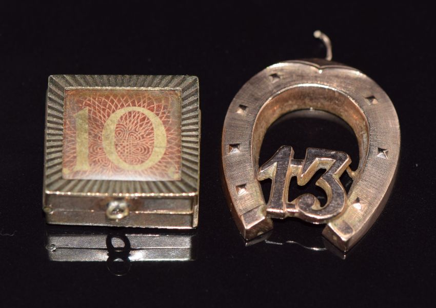 A 9ct rose gold pendant/ charm in the form of a horseshoe and 13 and a 9ct gold locket/ charm with a 10 shilling note, 6g