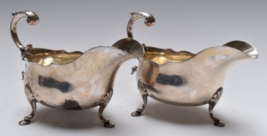 Pair of Victorian hallmarked silver sauce or gravy boats with S scroll handles, raised on shell decorated hoof feet, Sheffield 1895 maker Atkin Brothers, length 15.5cm, weight 388g
