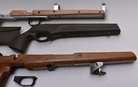 Three target rifle stocks including one composite BSA and one with adjustable cheek piece together with an Anschutz trigger guard.