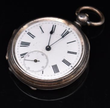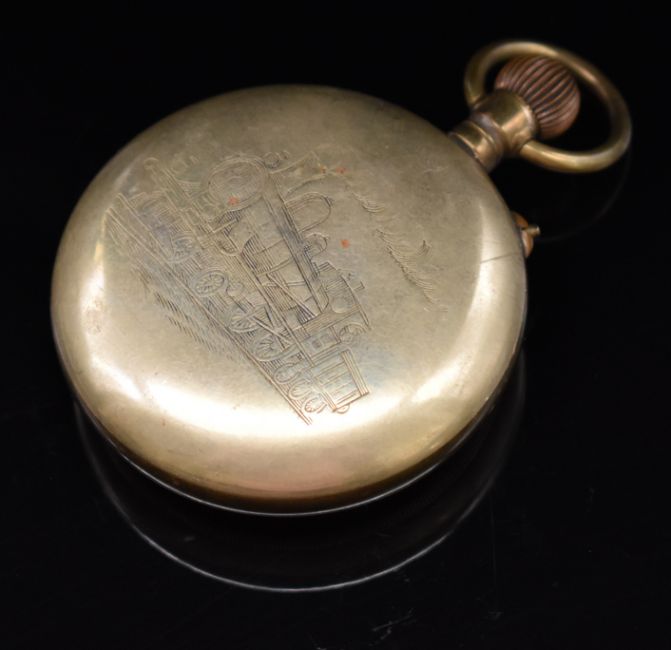 Three open faced pocket watches comprising Kay's Famous Lever hallmarked silver example, an unnamed silver example and an unnamed keyless winding example with engraving of a locomotive to the case back, largest 28mm in diameter.
