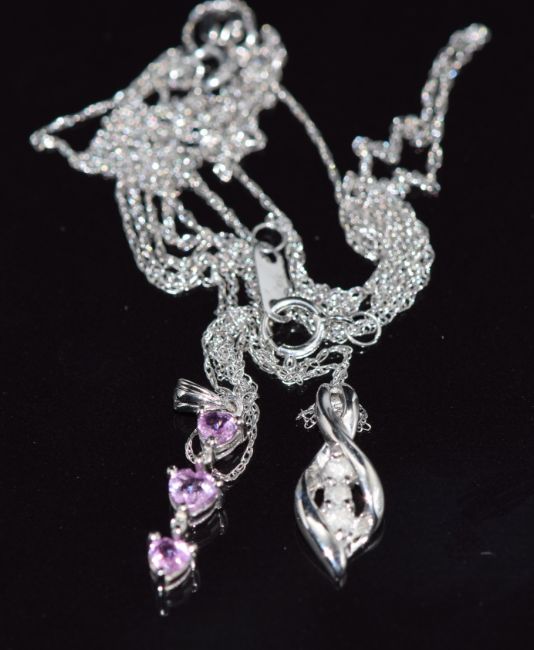 Two 10k white gold pendants, one set with pink sapphires and the other diamonds, on 10k white gold chains, 2.2g