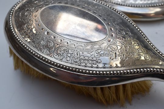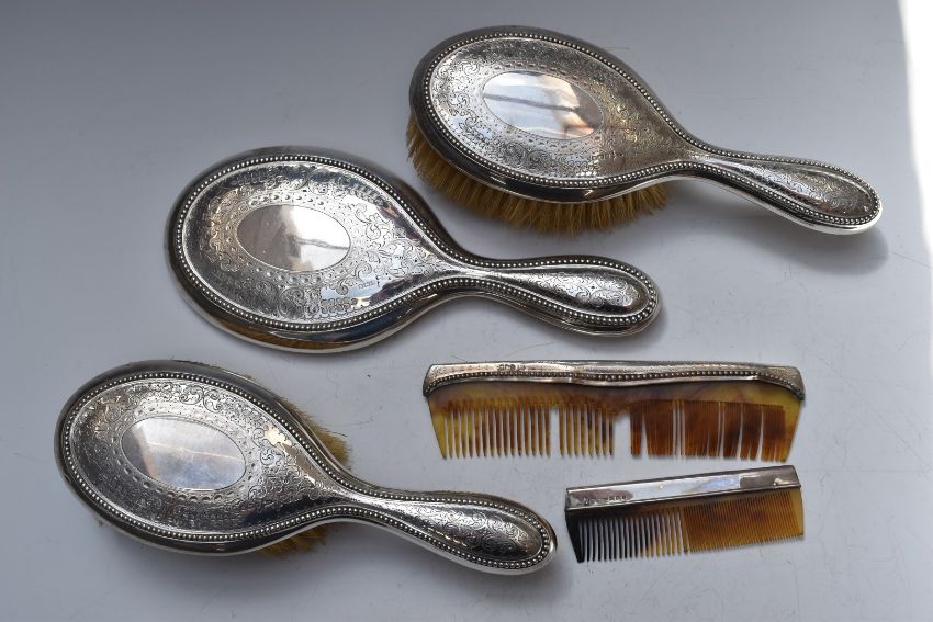 Walker & Hall Edward VII hallmarked silver dressing table set comprising hand mirror, two brushes and comb, Sheffield 1905, together with a further hallmarked silver mounted comb