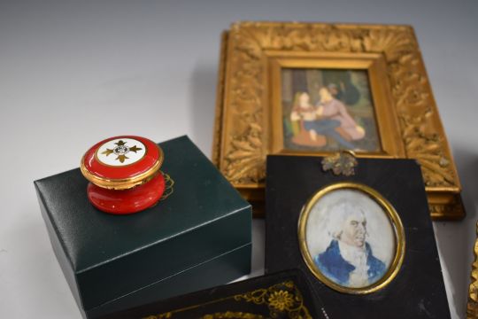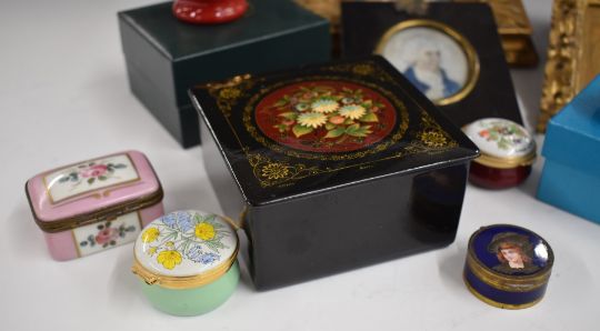 A collection of 19thC and later enamel boxes including Halcyon Days, continental example with portrait of a man in hat to lid, Russian lacquer box, portrait miniatures etc, largest frame 20 x18cm