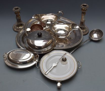 Silver plated ware including a pair of Harrods oval serving platters with gadrooned edges, Harrods food warmer, gravy boats and a pair of telescopic candlesticks
