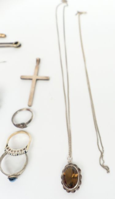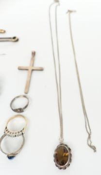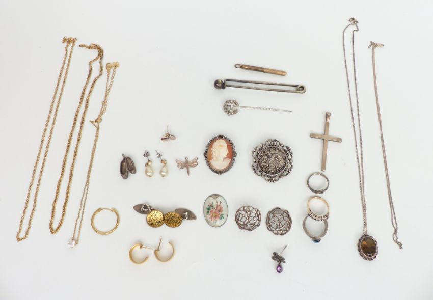 A cameo brooch, Swarovski necklace, white metal pin, silver ring, silver earrings, Victorian silver and gilt cufflinks, silver jewellery, hunting stick pin, etc