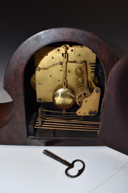 A c1930 DRP Deutches Reichs Patent mantel clock in Napoleon hat style mahogany case, three train movement by Isgus stamped 57873 Pendelange 16 and metal dial with Arabic numerals and pierced hands