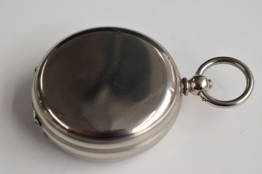James Joseph Hicks of London pocket barometer with blued hand and signed silver dial, case diameter 50mm.