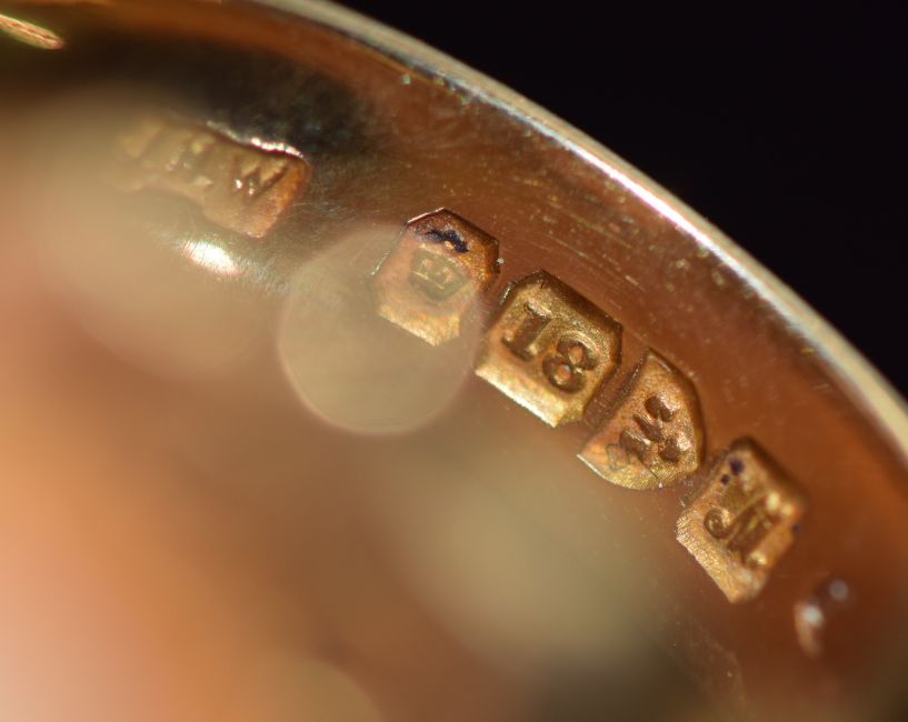 An 18ct signet ring with scrolling decoration to the shoulders, Chester 1912 , 8.4g, size O