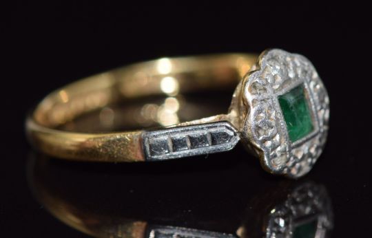 An 18ct gold ring set with an emerald and diamonds in a platinum setting, 2.4g, size N